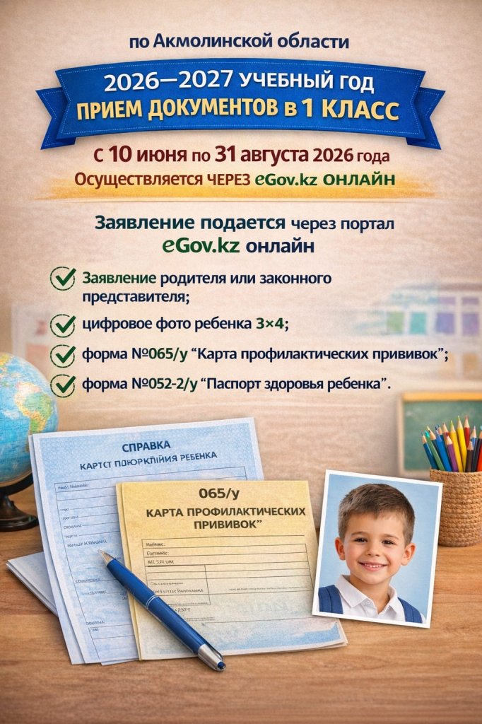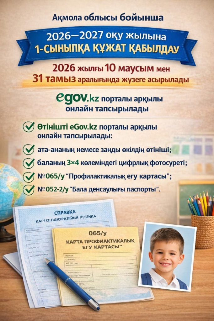 2026–2027 оқу жылына 1-сыныпқа құжат қабылдау Ақмола облысы бойынша 2026 жылғы 10 маусым мен 31 тамыз аралығында жүзеге асырылады. Өтінішті eGov.kz порталы арқылы онлайн тапсырылады.